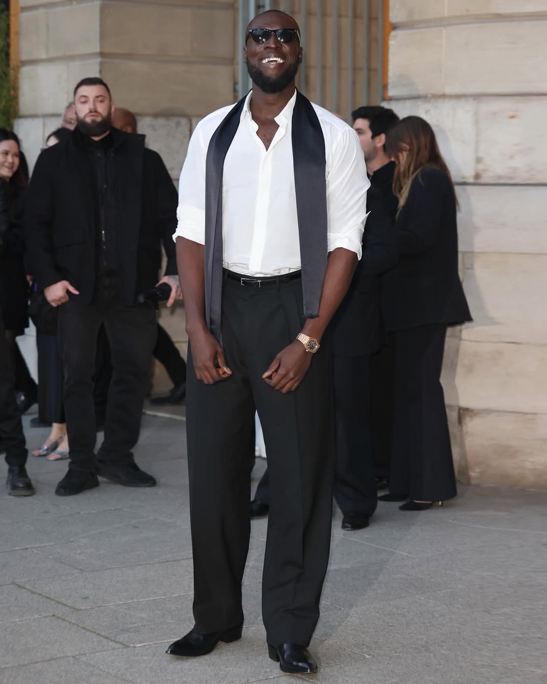 Stormzy attended in a white shirt with black trousers and a black scarf at his neck. To complement it, he wore black shoes and a statement watch. His dark sunglasses completed the look.