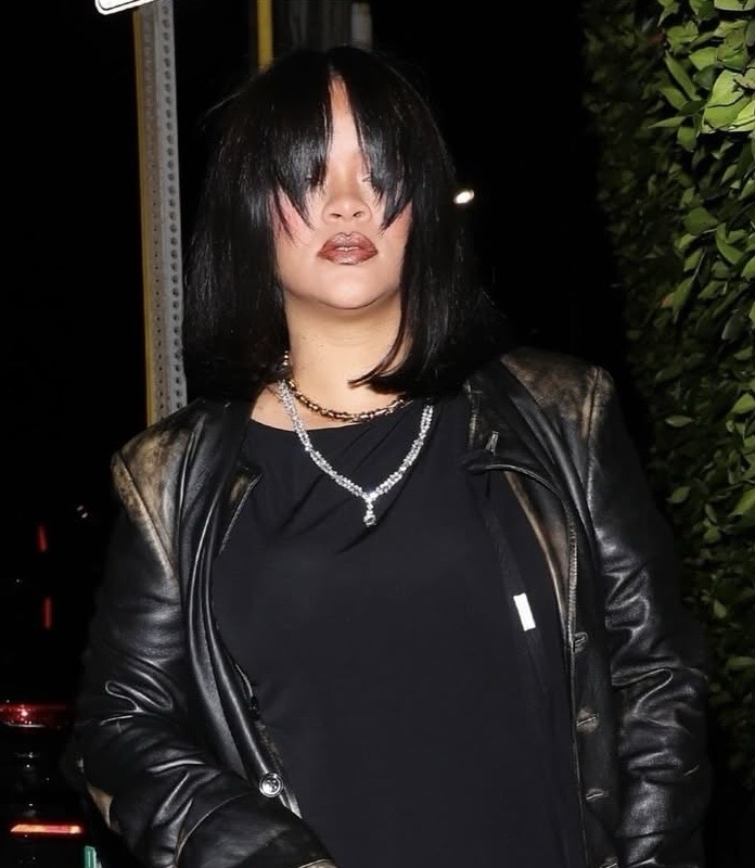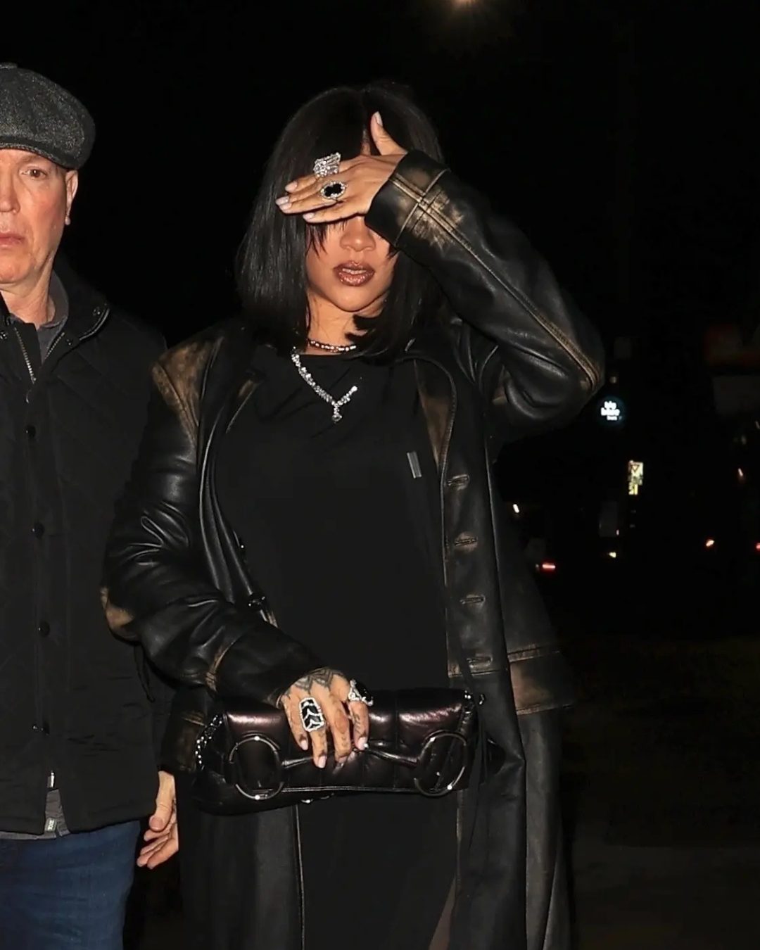 Rihanna styled a form-fitting black maxi dress with a thigh-high side slit, adding black stockings and closed-toe pumps to keep the look sharp. She layered everything under a long black leather trench coat that tied the outfit together. For accessories, she kept it simple; a sparkling diamond necklace, stack of rings, and a black Gucci clutch. Her hair was styled in a straight, shoulder-length look with soft bangs that covered her eyes.