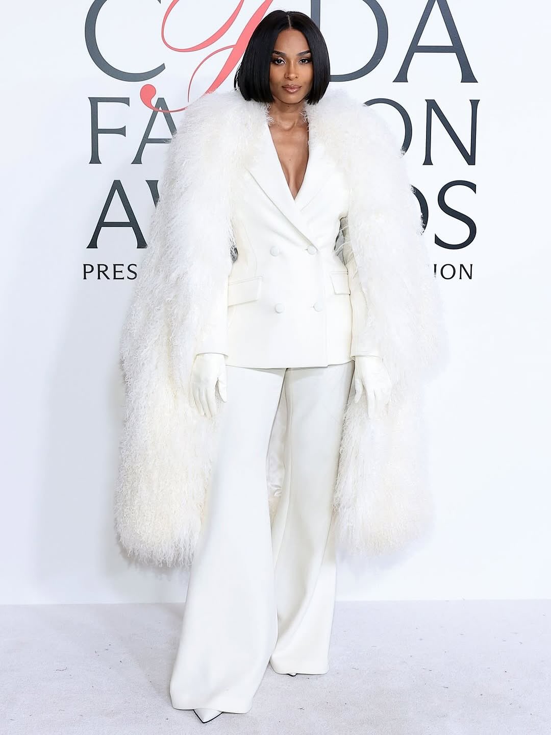 The singer wore an all-white double-breasted suit from Sergio Hudson, styled with wide-leg trousers. She topped it off with a fuzzy fur coat, leather gloves, and a pair of white pumps. Her signature bob hairstyle brought contrast to the outfit.