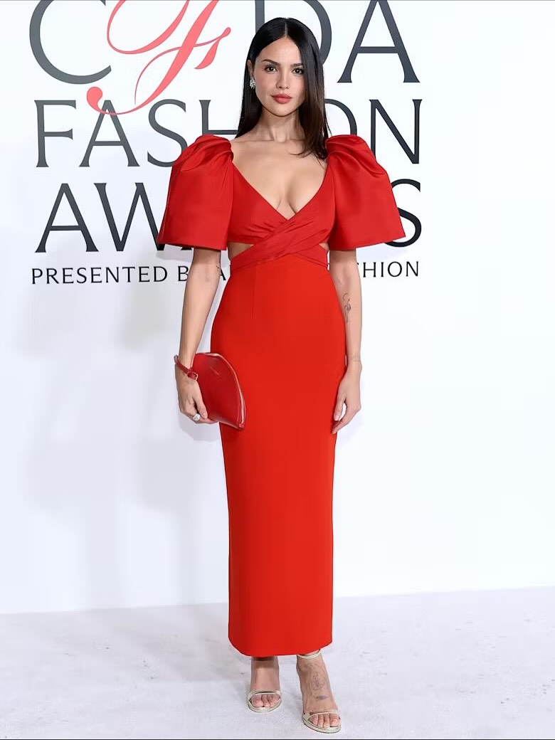 Eiza appeared in a bold red gown with puffed sleeves from Carolina Herrera’s Spring/Summer 2026 collection. The deep-V neckline and subtle cut-outs at the side added depth to the look. She completed the look with gold sandal by Stuart Weitzman shoes.