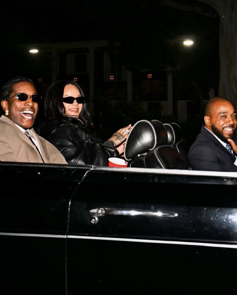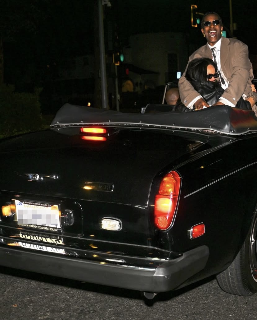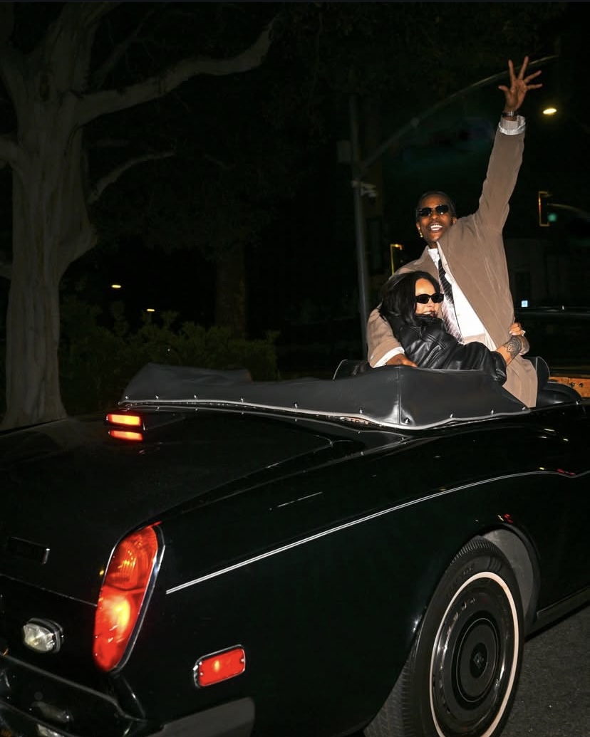 Driving through Hollywood in a Rolls-Royce, the all-time favorite couple were all grins and waving, hugging and cheering from the open convertible. Rocky stood up in the car, drink in hand, in a tan tailored suit and a highly shiny silver tie that, in his signature style, merged classic fashion with modern playfulness He completed the appearance with swirly gold earrings, sunglasses, and an orange sapphire pinky ring set with diamonds. And, of course, the best birthday vibes.