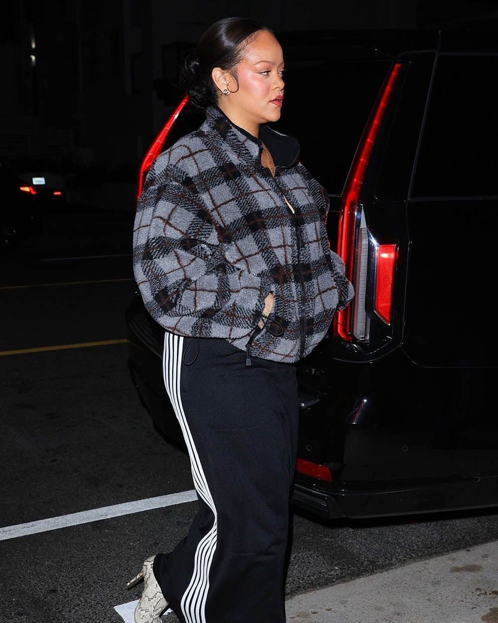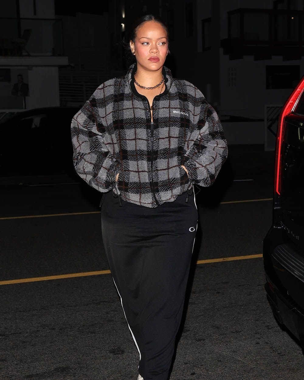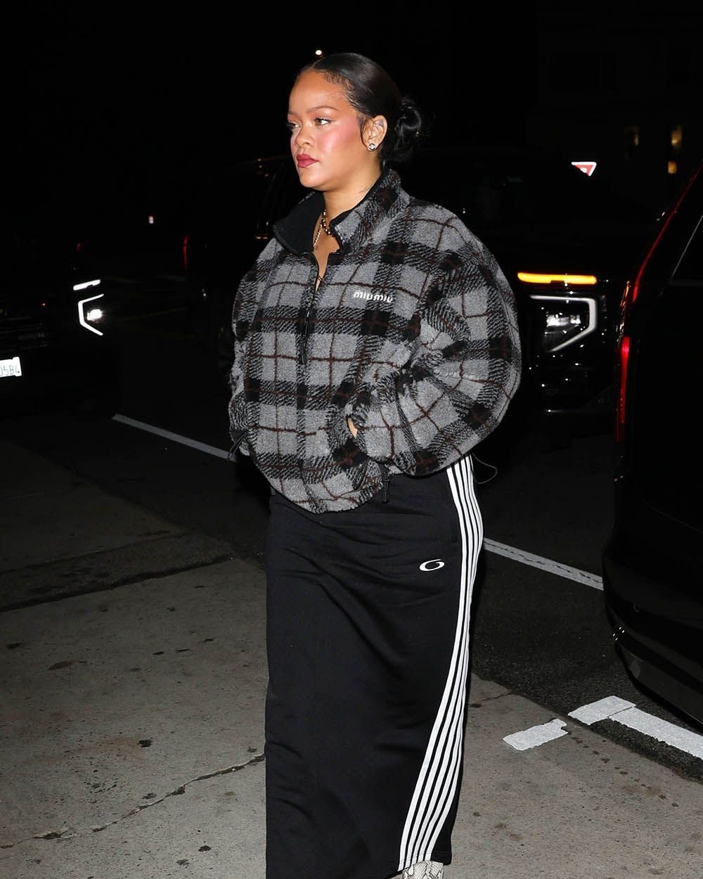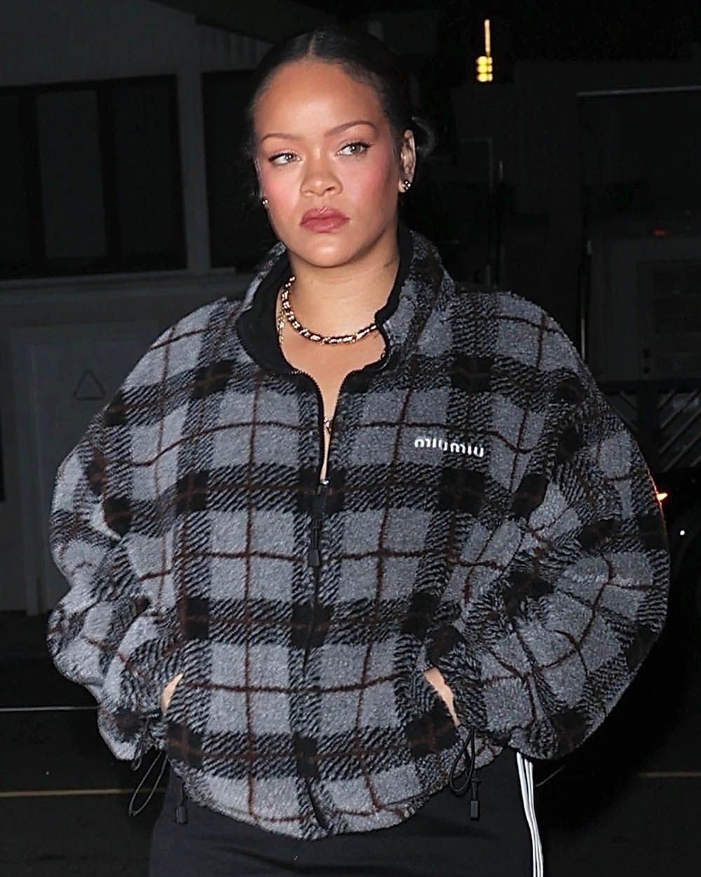 Rihanna was photographed arriving at Giorgio Baldi in Santa Monica for a late-night dinner on Sunday wearing a Miu Miu jacket paired with Amina Muaddi snakeskin boots. She was captured as she made her way into the restaurant. The atmosphere was laid-back.