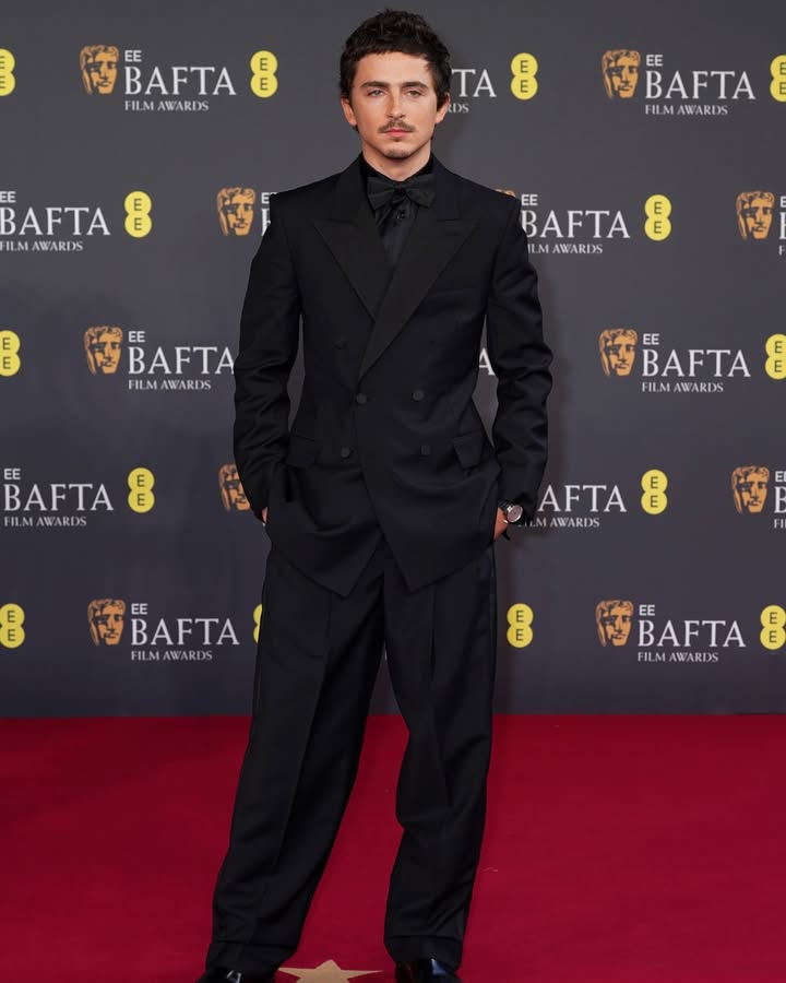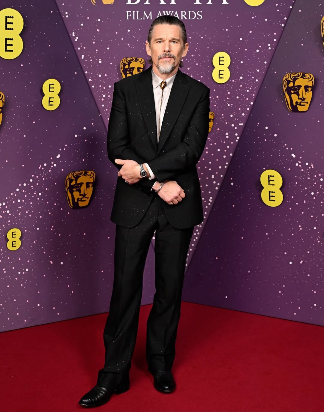 Menswear followed a familiar pattern, with many opting for the traditional black tuxedo. Timothée Chalamet arrived in a custom all-black Givenchy tuxedo. Leonardo DiCaprio also chose a classic black tuxedo paired with a bow tie. Ethan Hawke, however, introduced a subtle twist to the evening’s tailoring in a black tuxedo featuring glitter details, finished with a gold bolo tie that set him apart.