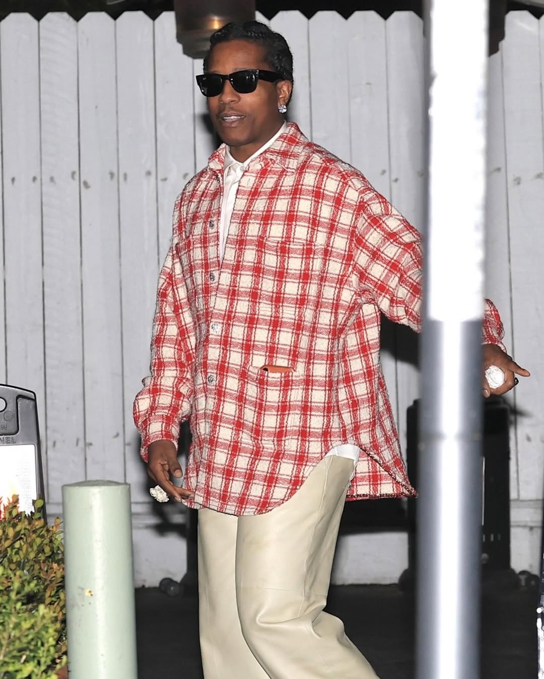 A$AP Rocky remained faithful to his signature street-style. He wore a red-and-white checkered jacket layered over a white shirt, paired with tan trousers and black loafers. Accessories included a pair of Ray-Ban sunglasses.