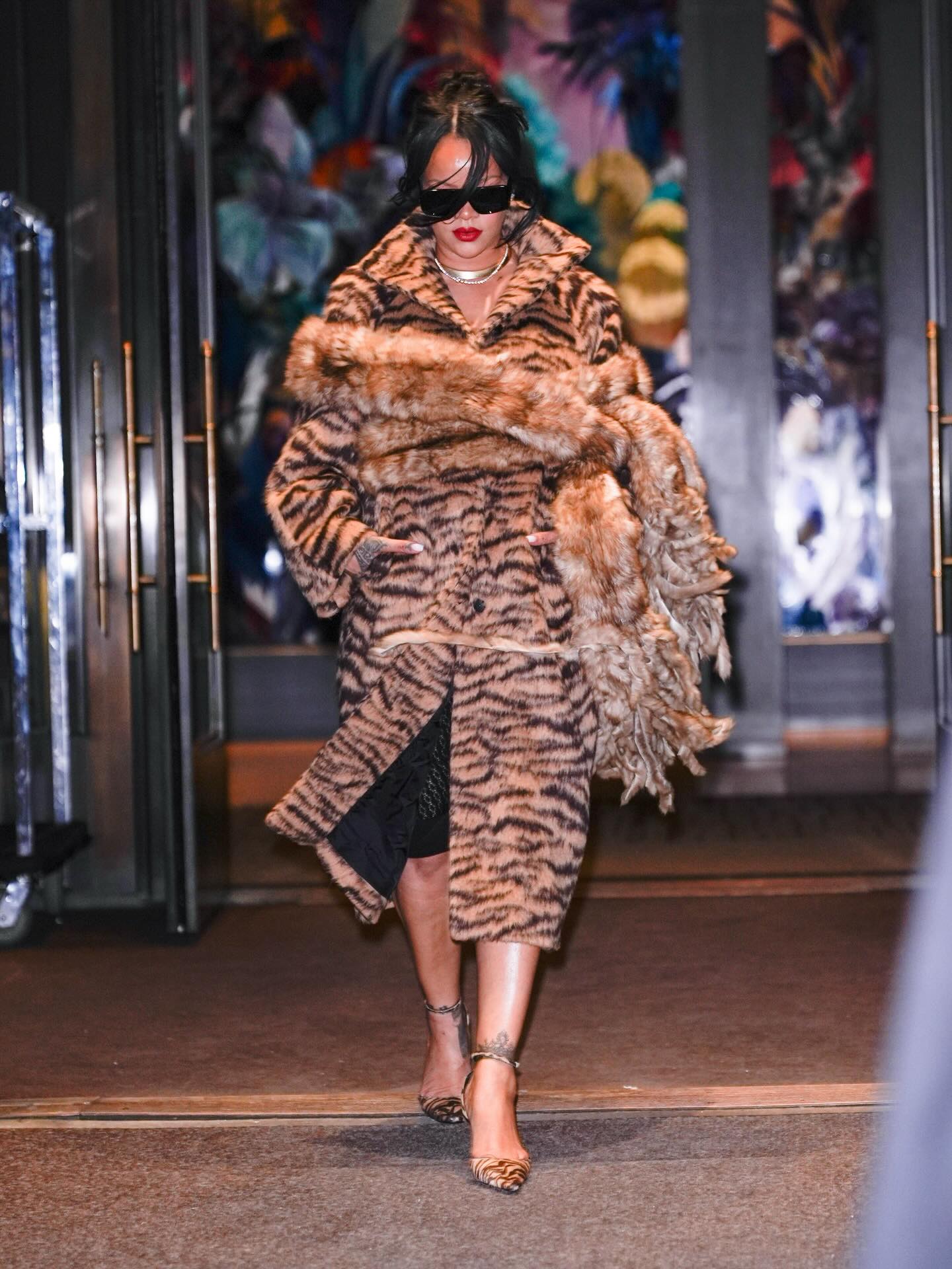 Rihanna’s appearance highlighted the resurgence of tiger and animal prints across fashion streets and runways in 2026. Vogue noted her tiger-print heels as part of an ’80s-inspired animal-print revival, distinct from more traditional leopard or cheetah prints.