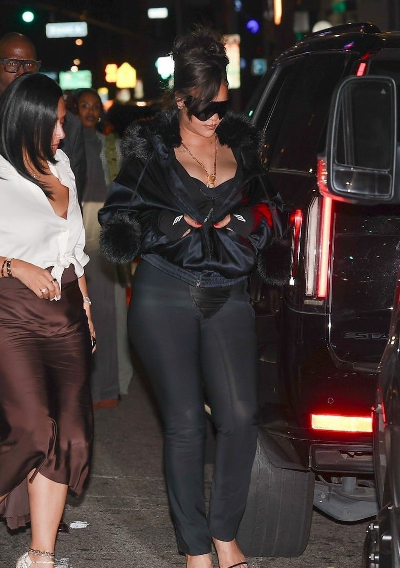 For the occasion, Rihanna wore an all-black outfit, pairing skintight trousers with a low-cut top and layering the look with a black puffer jacket trimmed with faux fur. She completed the outfit with heels, statement jewellery, and oversized black sunglasses, keeping the styling clean and smooth.
