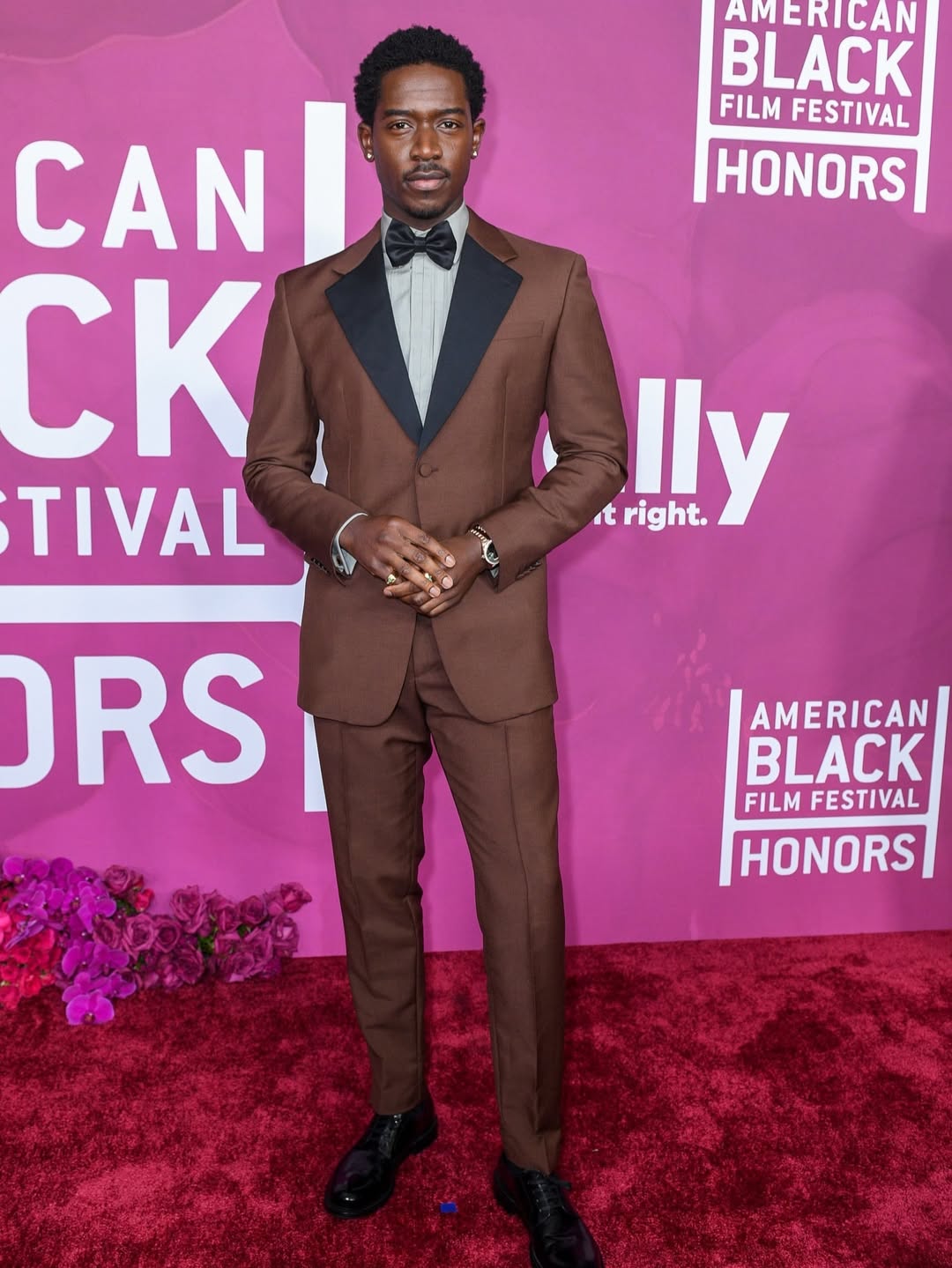 Wunmi Mosaku appeared in a maroon gown featuring flowing off-the-shoulder sleeve-like fabric. Vivica A. Fox also wore a maroon gown with in velvet. The actress’ sleeveless dress had a jeweled neckline. She carried a matching clutch.