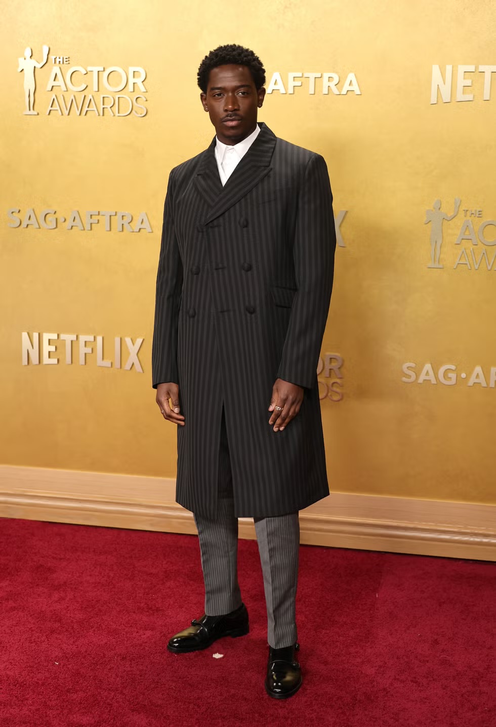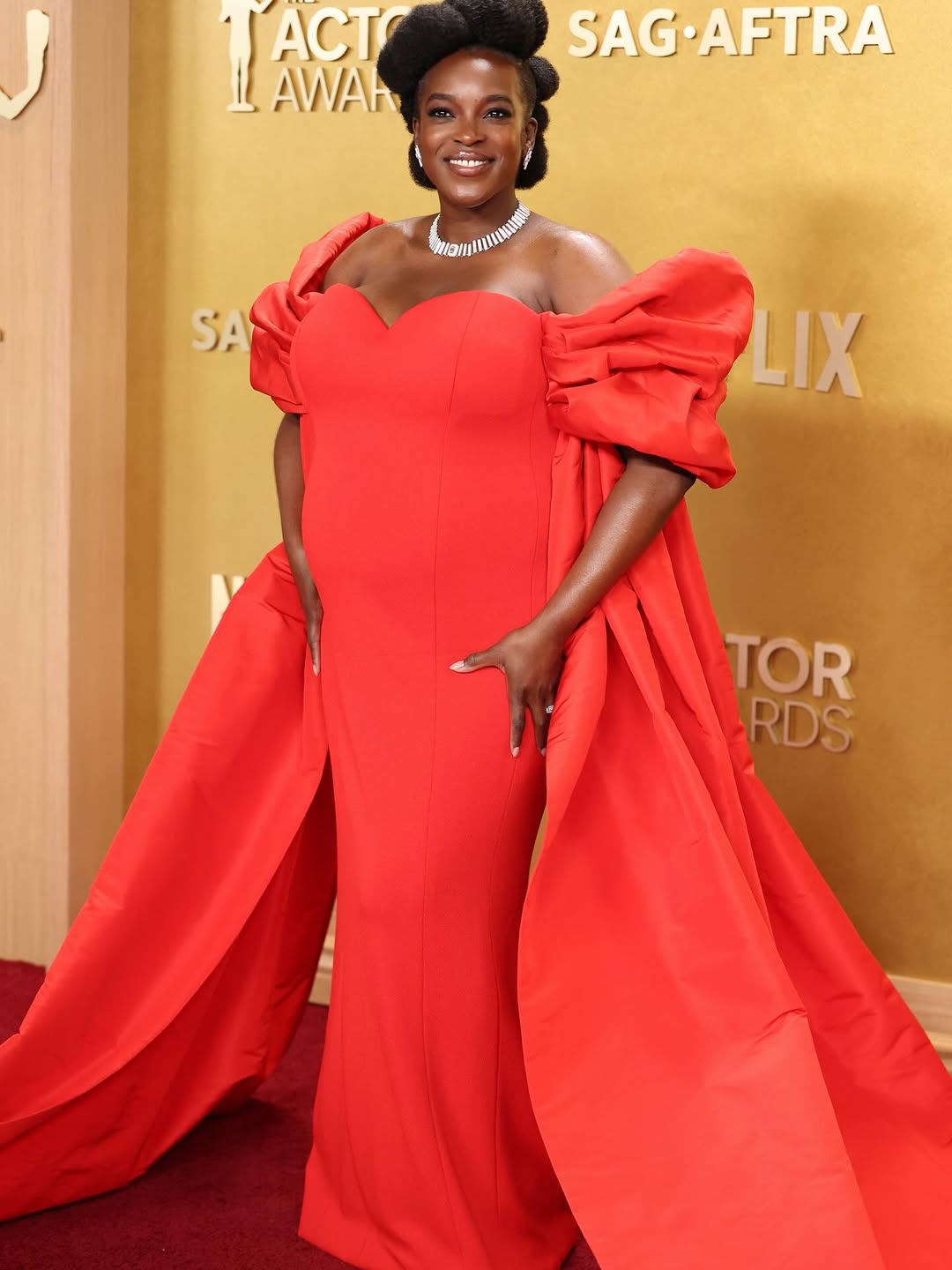 Chase Infinity continued her on going collaboration with Louis Vuitton, wearing a shimmering gold gown with a sculpted bodice, long sleeves, and a small mermaid-style skirt, paired with a matching beaded cap. Wunmi Mosaku also wore Louis Vuitton, appearing in a red gown.