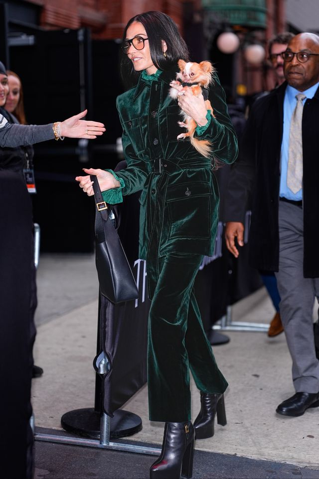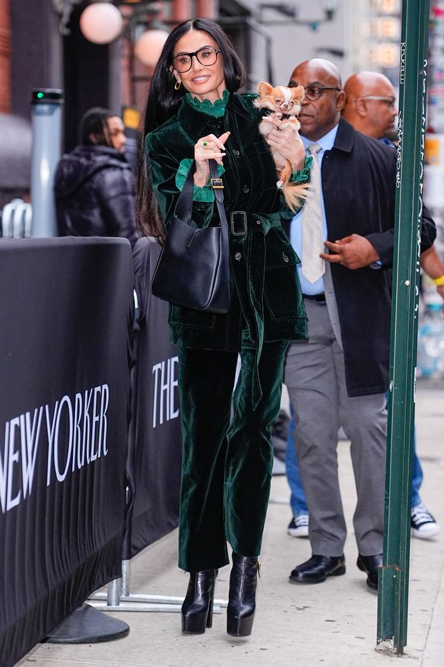 Read more: Demi Moore walks her dog in emerald-green velvet and towering platforms