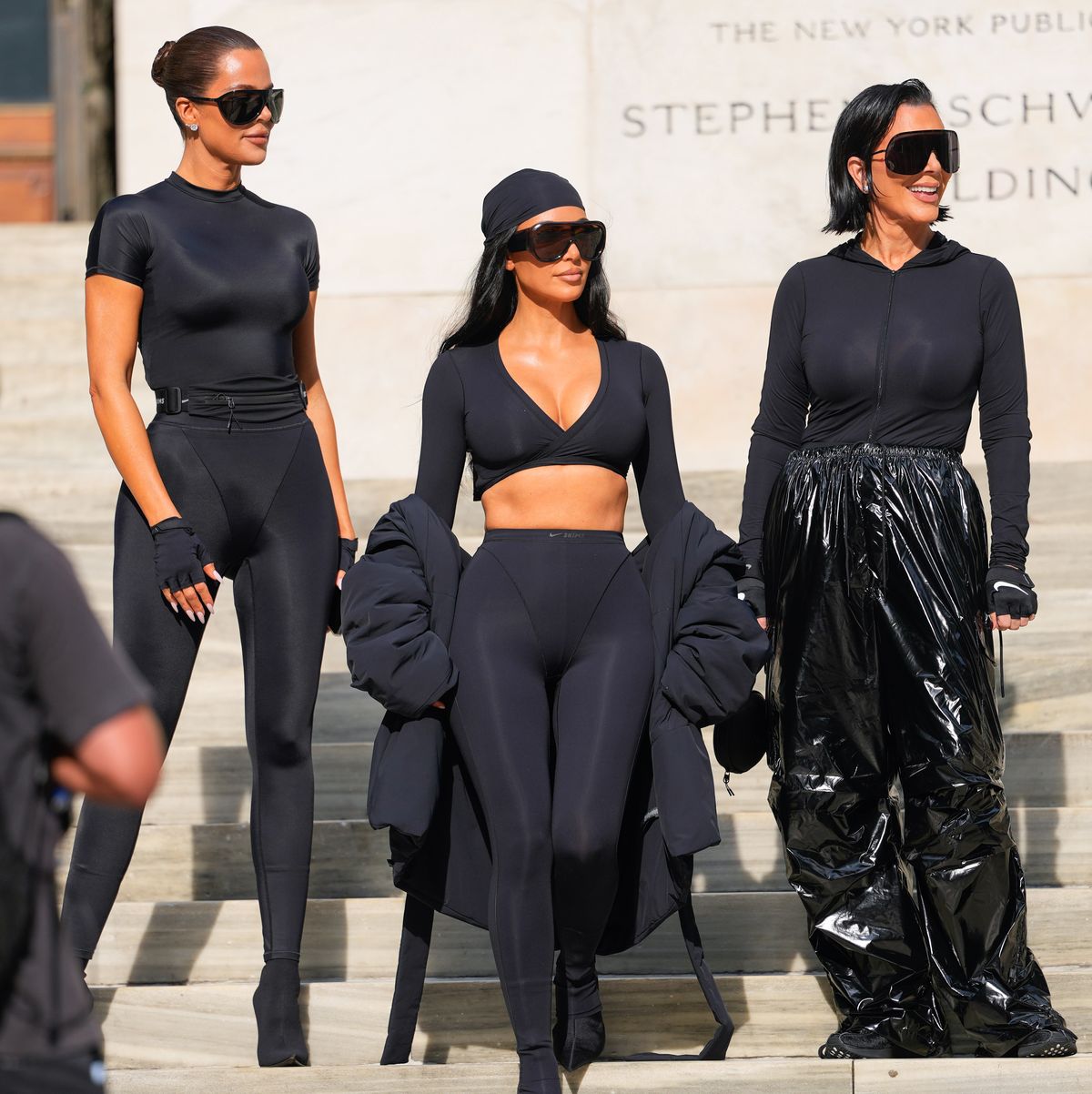Kim, arrived in a long-sleeve crop top and high-waisted leggings from the NikeSkims collection, paired it with a puffy coat, pointed heels, and an elastic head wrap. Khloé wore a short-sleeve catsuit styled with a fanny pack-style belt, plus her own matching heels and workout gloves. Kris joined in wearing a hooded zip-up jacket paired with cargo pants, and sneakers, accessorized with her signature oversized sunglasses. Together, the three matched in all black, giving a unified look.