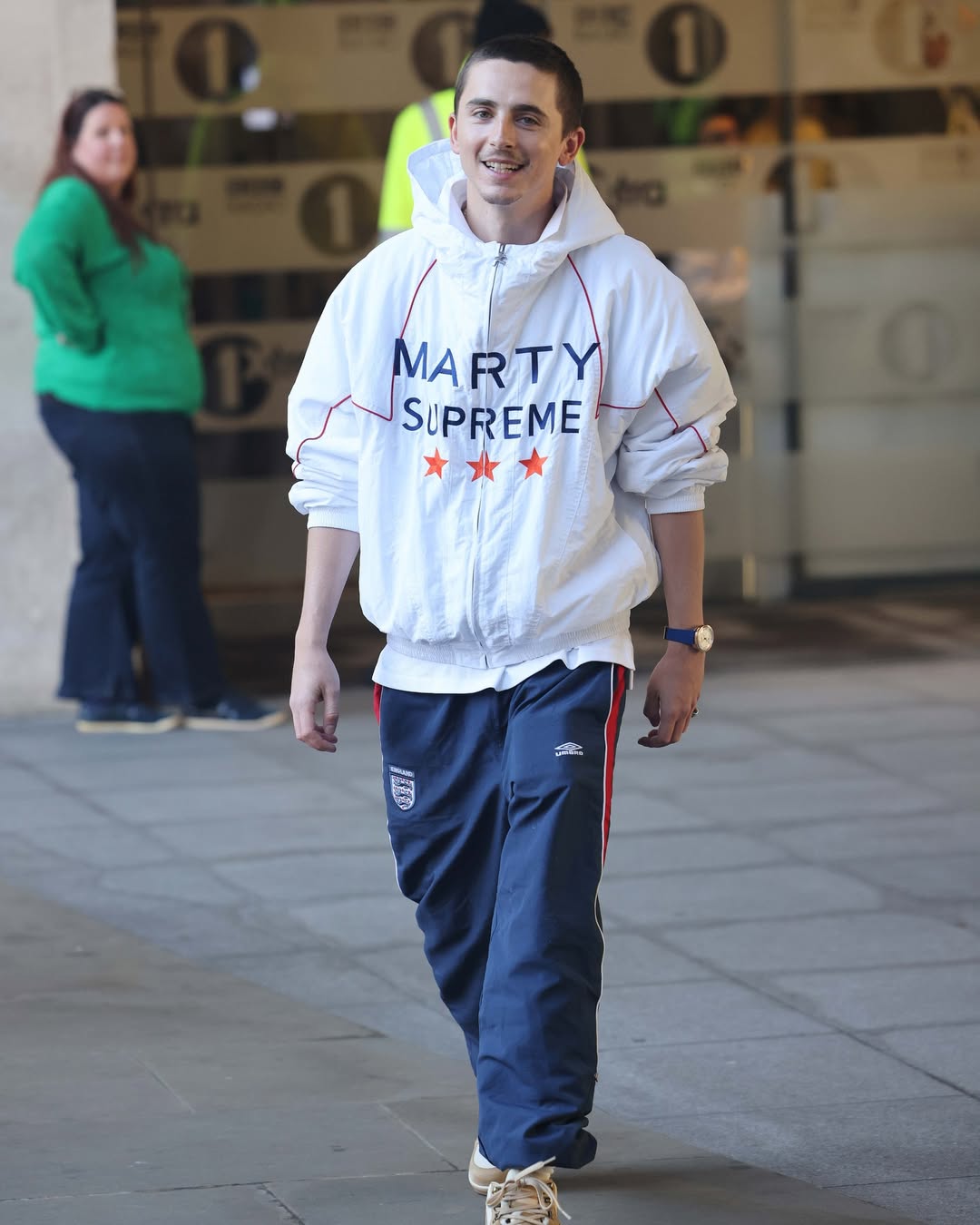 Similarly, Timothee Chalamet, nominated for Marty Supreme, has made streetwear a signature part of his style, often introducing a bright color to darker minimal foundations. He was photographed across the street in a casual hoodie paired with track trousers and sneakers.
