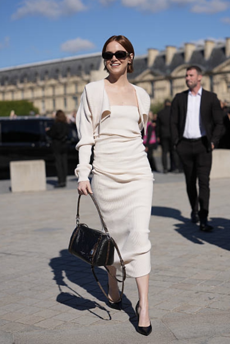 Emma Stone, who is nominated for Best Actress for Bugonia, was spotted at the Spring 2026 ready-to-wear shows in Paris with a ribbed off-white knit dress.