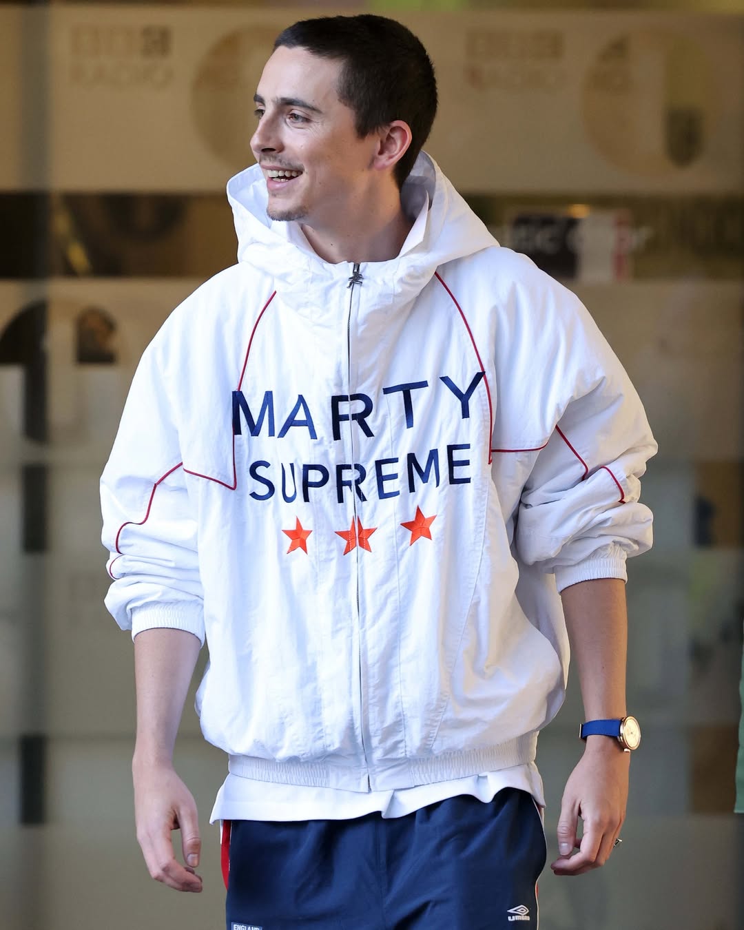 Similarly, Timothee Chalamet, nominated for Marty Supreme, has made streetwear a signature part of his style, often introducing a bright color to darker minimal foundations. He was photographed across the street in a casual hoodie paired with track trousers and sneakers.