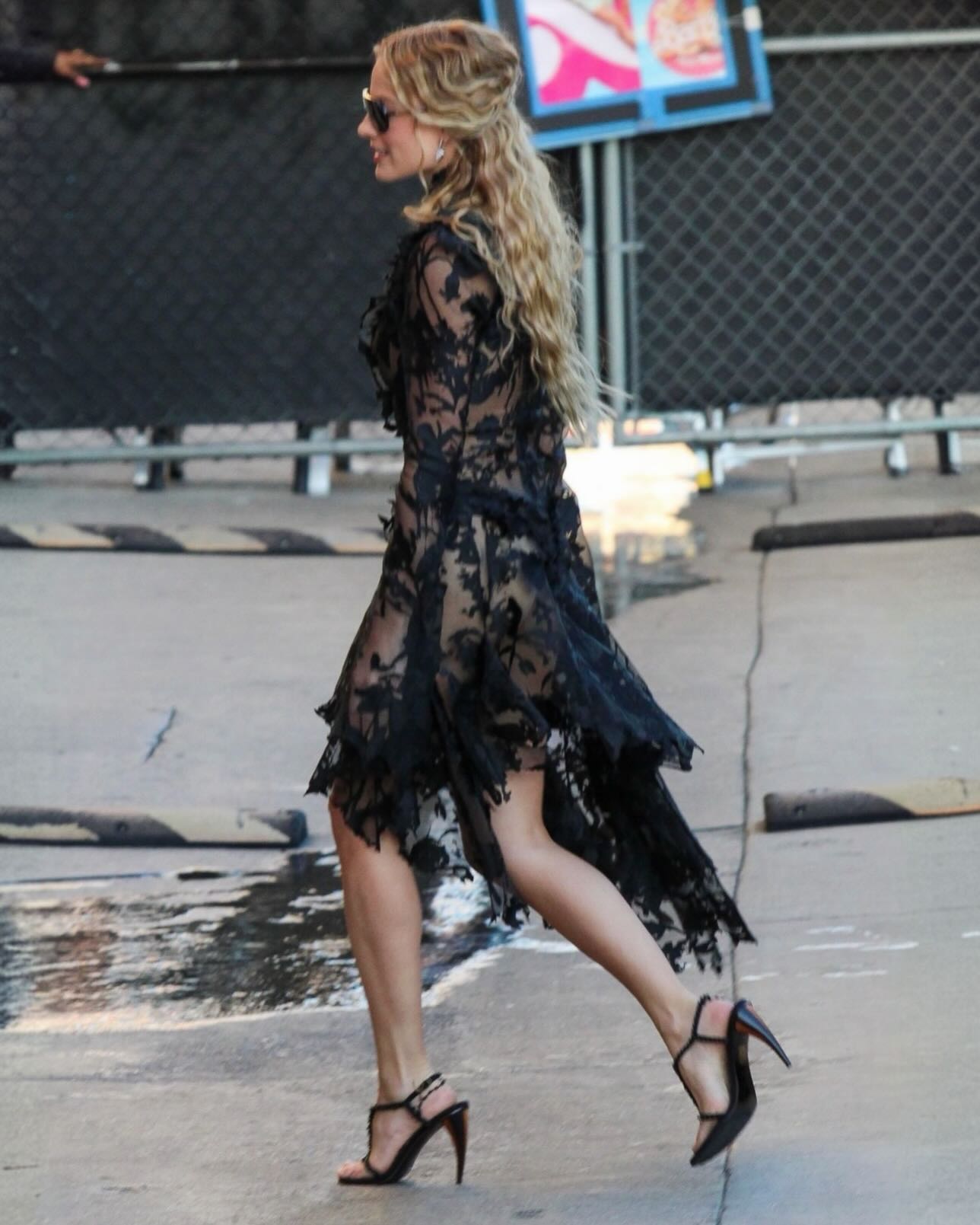 For the Kimmel appearance, Robbie wore a black lace sheer dress from Alexander McQueen’s Spring/Summer 2026 collection, styled by Andrew Mukamal. The dress featured full sleeves and a floral lace pattern, paired with black high-heeled shoes and minimal jewelry. Photographs from the event show her hair styled in soft curls framing her face, and on arrival she was pictured wearing sunglasses and pearl-drop earrings.