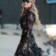 For the Kimmel appearance, Robbie wore a black lace sheer dress from Alexander McQueen’s Spring/Summer 2026 collection, styled by Andrew Mukamal. The dress featured full sleeves and a floral lace pattern, paired with black high-heeled shoes and minimal jewelry. Photographs from the event show her hair styled in soft curls framing her face, and on arrival she was pictured wearing sunglasses and pearl-drop earrings.