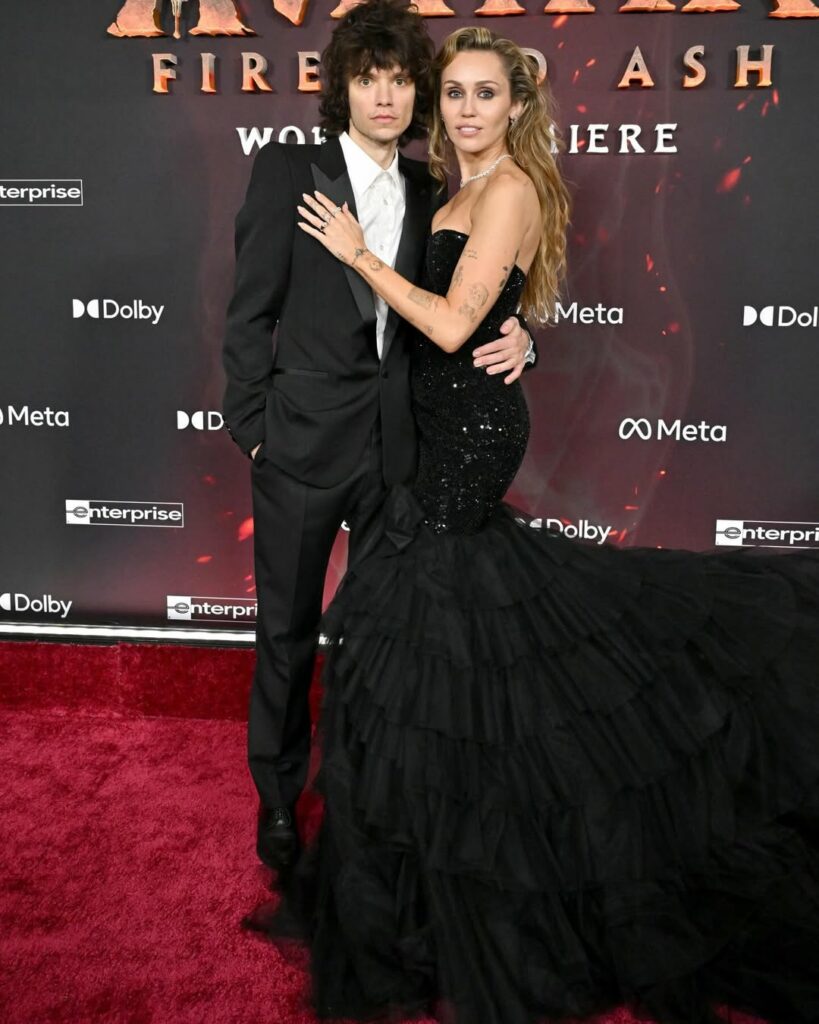 The engagement ring itself has made waves. First noticed during Miley’s birthday on November 23, it reappeared at the premiere, perfectly timed for the spotlight. Jewelry experts estimate the diamond’s value between $150,000 and $450,000, with the yellow-gold, east-west cushion cut lending it a bold, rock‑and‑roll vibe while still reading bridal.